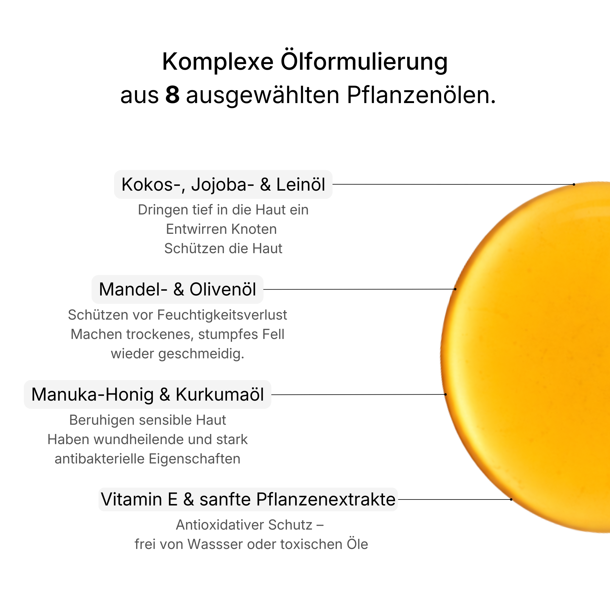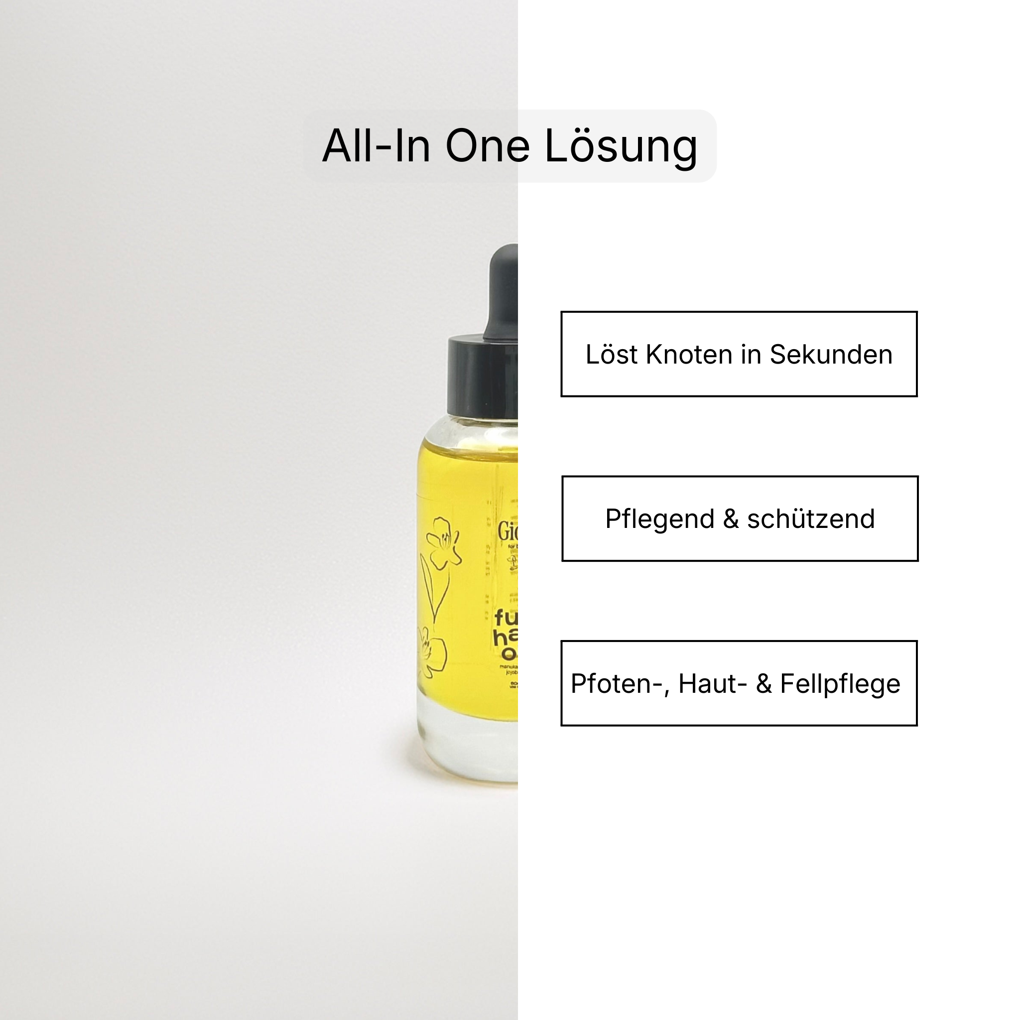 Pflegeöl für empfindliche Haut & anspruchsvolles Fell – löst Knoten, stärkt die Hautbarriere und legt einen schützenden Film über Haut und Fell, um Knotenbildung und Trockenheit vorzubeugen.